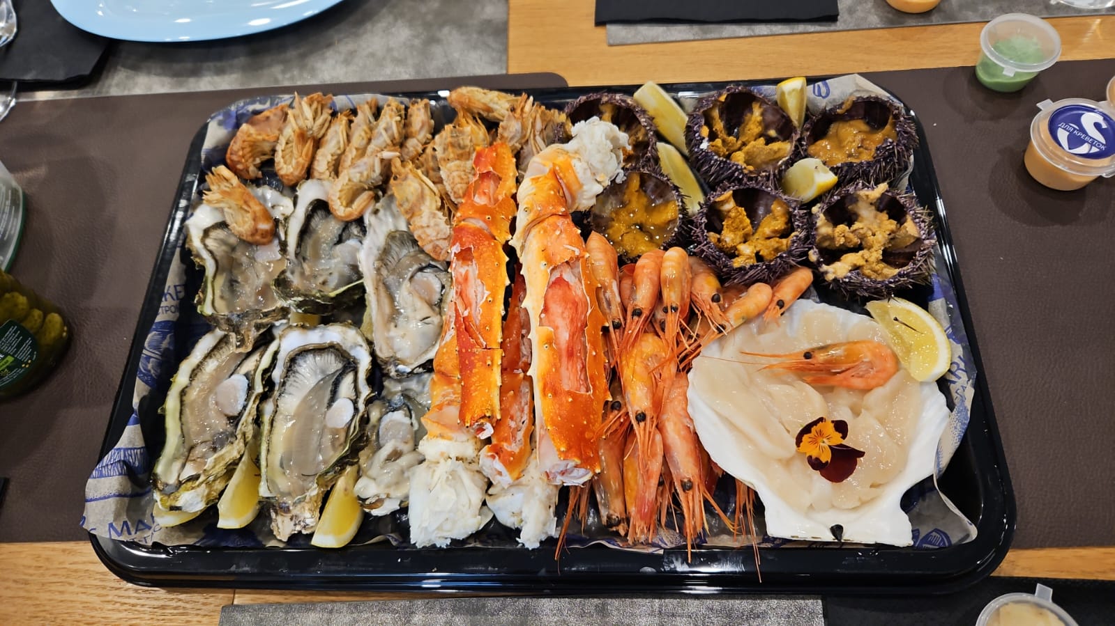 Мы позаботились и для Вашего удобства взяли полностью сервировку на себя. Деликатесы доставляются уже открытыми на льду и украшенные кусочками свежего лимона. Так же, в комплект входят фирменные соусы и перепелиные желтки которые гармонично подчеркнут вкус свежайших морепродуктов.